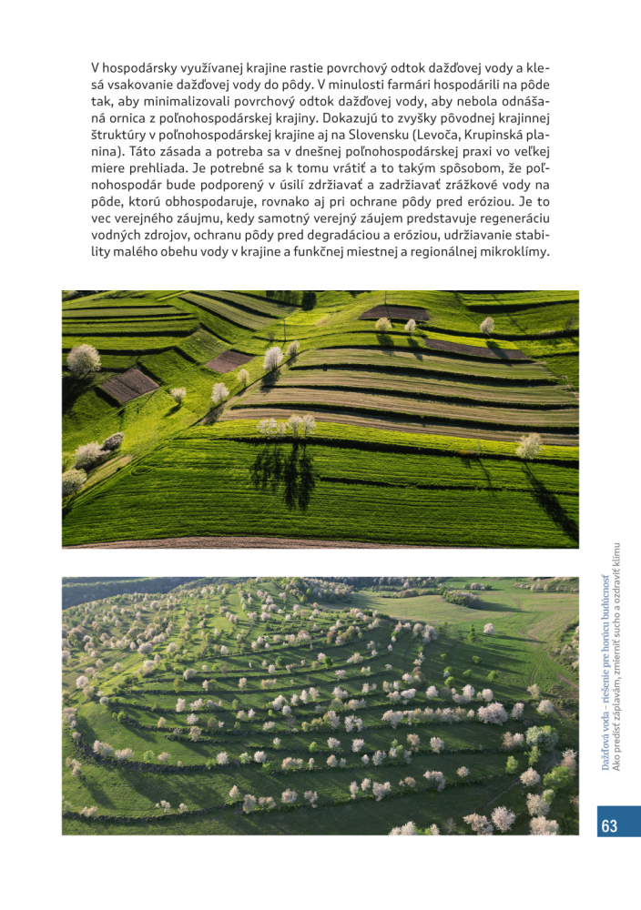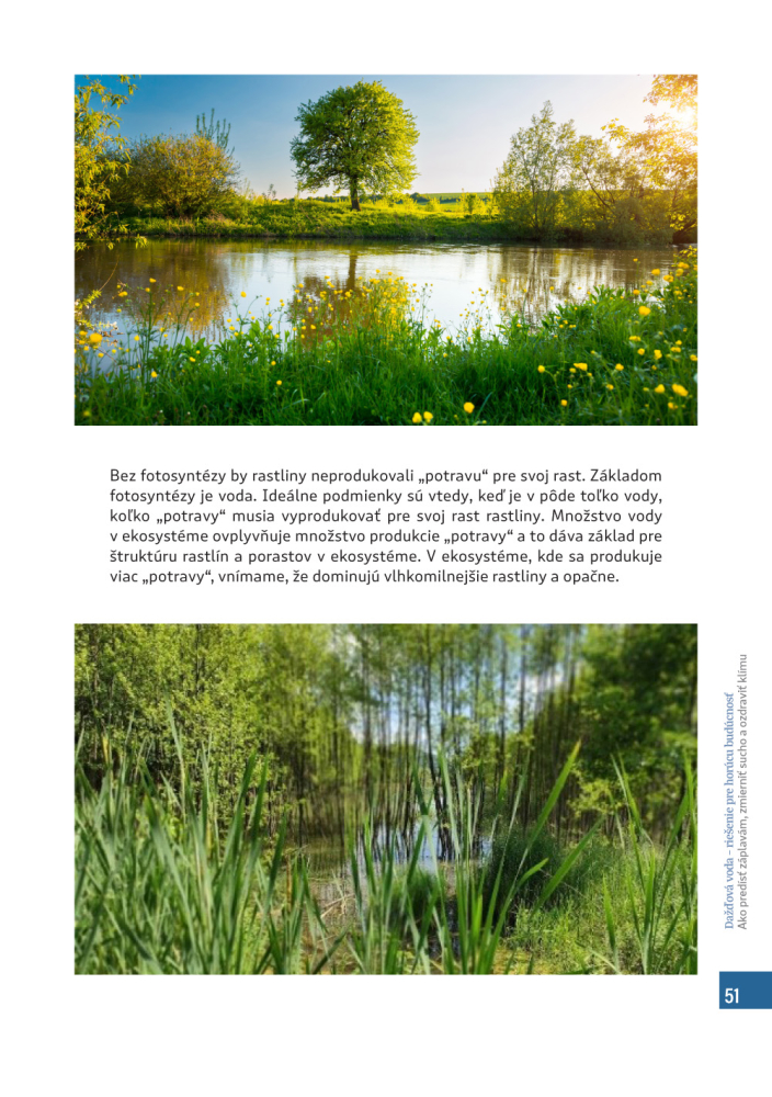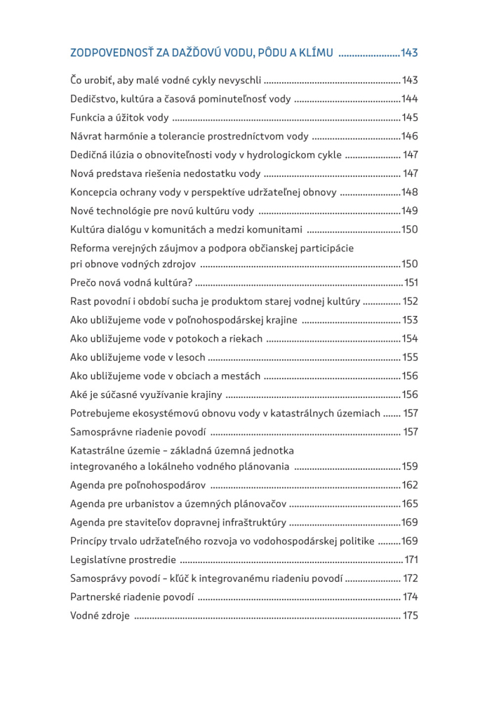 Naša publikácia preto ponúka riešenie do horúcich rokov neistej budúcnosti. Poskytne návod, ako dobre hospodáriť s dažďovou vodou a udržať tak odolnú štruktúru krajiny. Je určená ľuďom v mestách i na vidieku, učiteľom, farmárom, lesníkom, ale i staviteľom budov a majiteľom firiem, starostom a verejným predstaviteľom.
